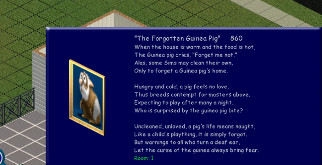 Tempo dopo il mio fidanzatino dell’epoca mi aveva portato un CD con un po’ di oggetti nuovi scaricati direttamente dal sito di The Sims: vasi di fiori, lampade, decorazioni un po’ kitsch… ed un porcellino d’india.